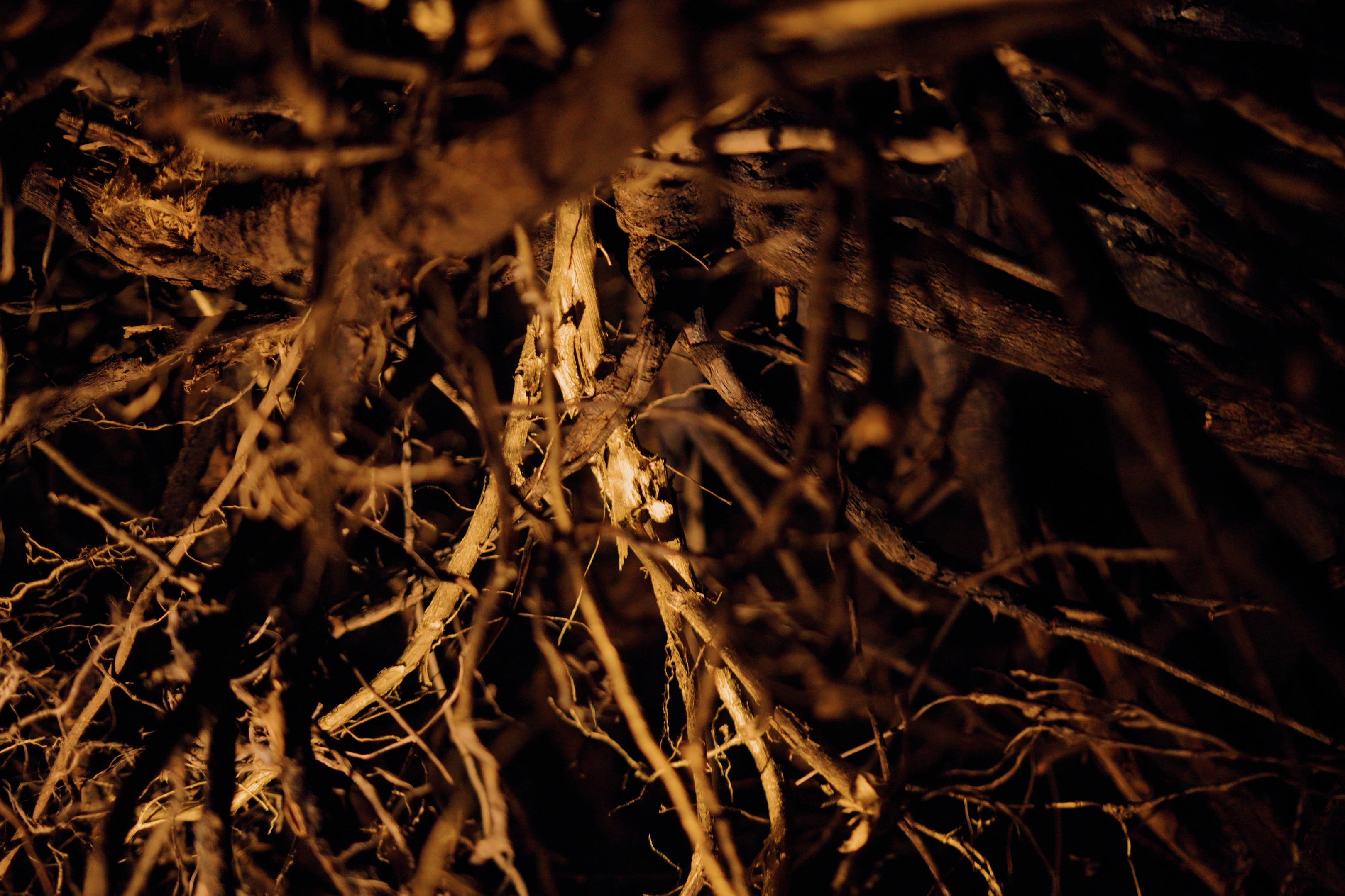 Une souche déracinée et carbonisée révèle son réseau de racines, comme une cartographie des forces cachées sous la surface.