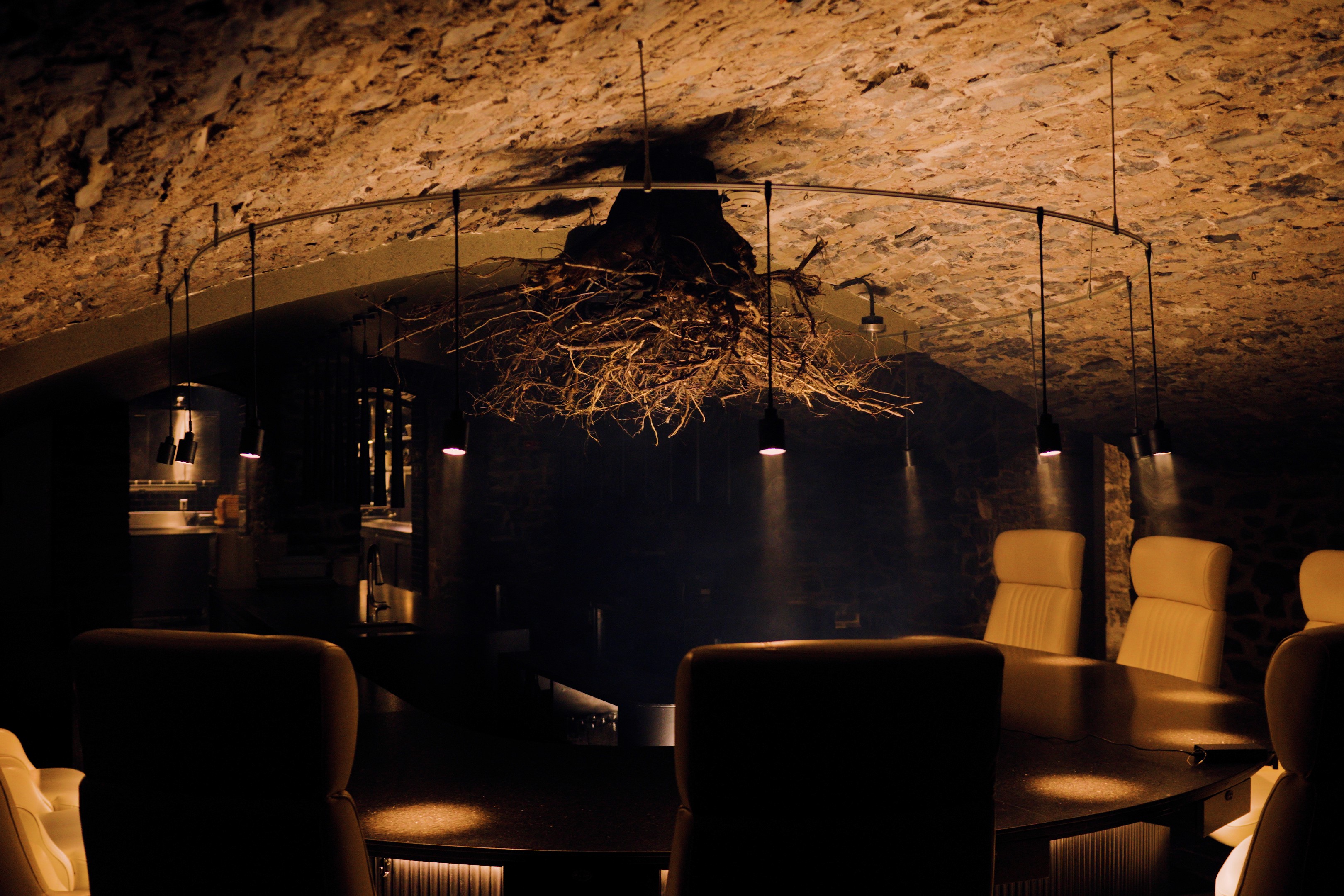 Installée au plafond de la section exclusive du comptoir-chef de La Tanière, située sept pieds sous terre dans une voûte de pierre, Mycelium devait sembler avoir toujours fait partie du lieu.