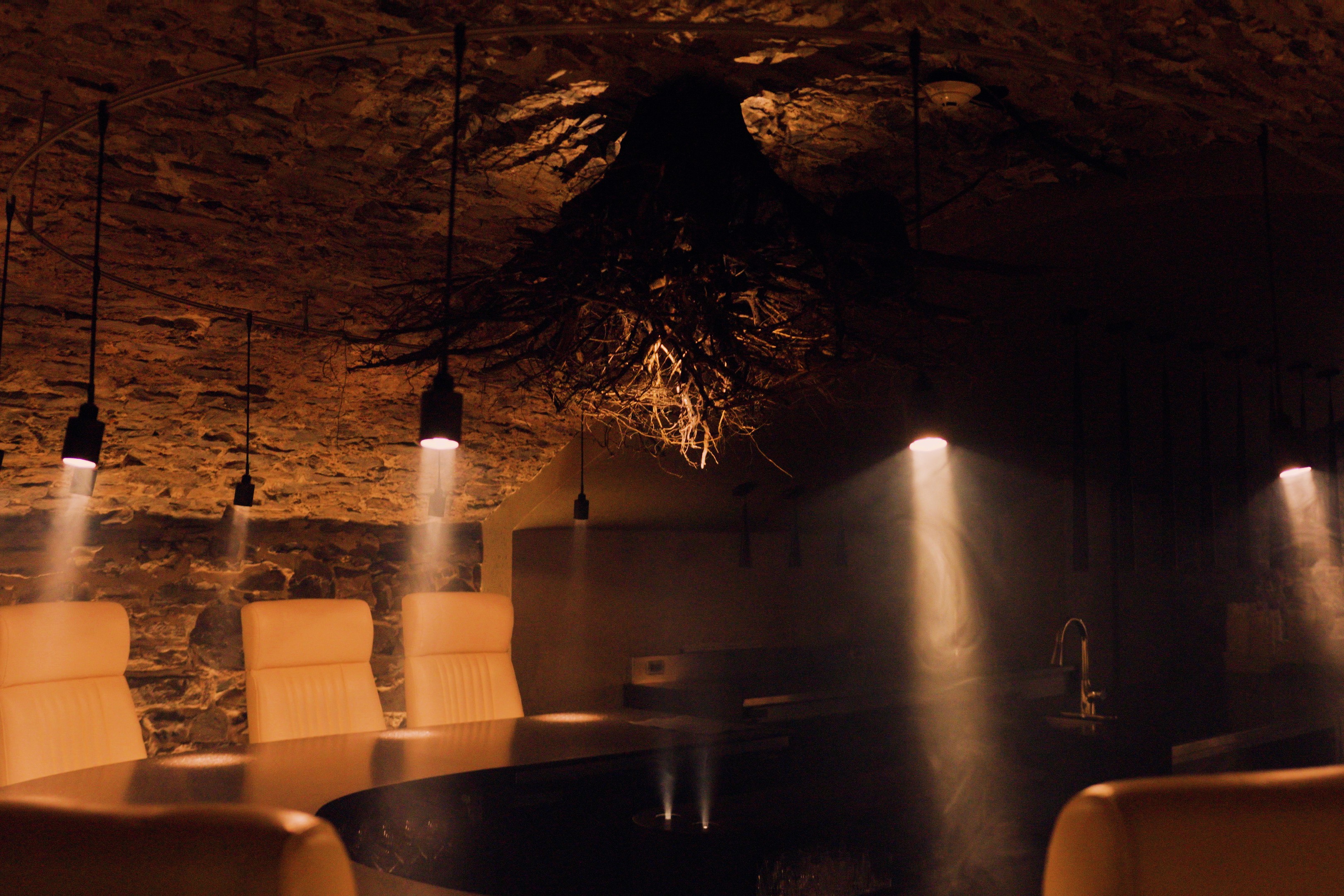 L’ensemble est suspendu au plafond à l’aide d’un système discret, tandis qu’un éclairage intégré projette les ombres des racines sur la voûte de pierre, transformant le plafond en prolongement de l’œuvre.